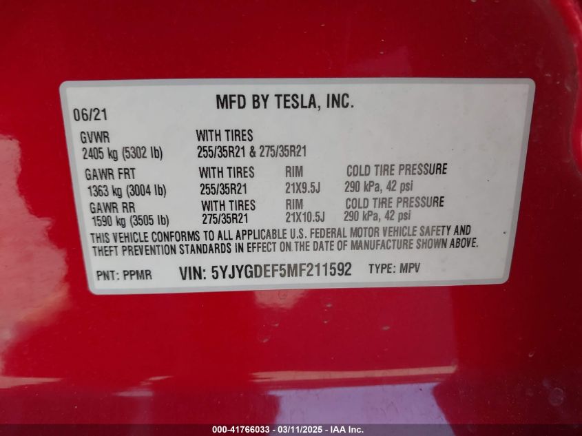2021 TESLA MODEL Y 2021 Electric, U, Full drive, VIN - 5YJYGDEF5MF****** from the USA