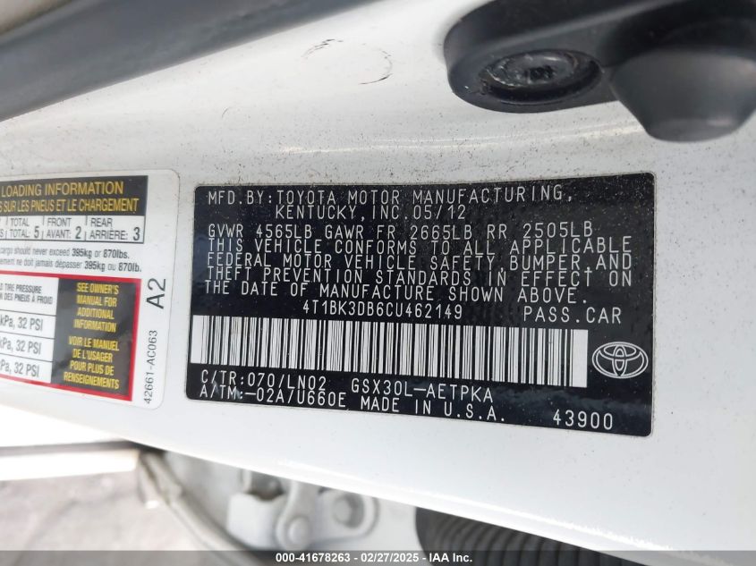 Color WhiteCylinders 6Drive Front wheel driveVIN 4T1BK3DB6CU******State Run & Drive VerifiedDamage Front or back AutoRIA