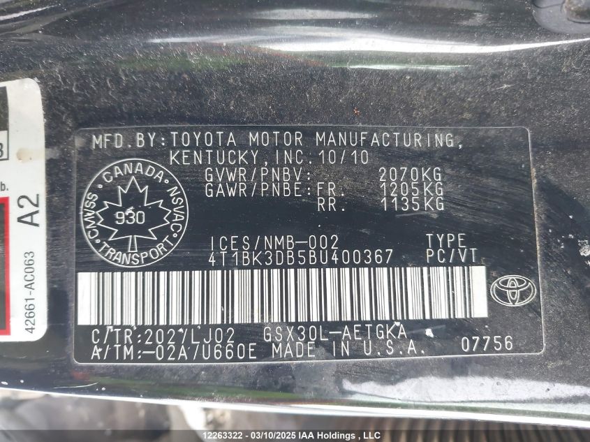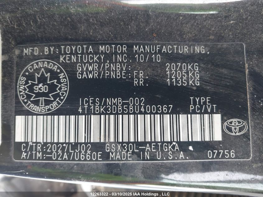 Color BlackCylinders 6Drive UnknownVIN 4T1BK3DB5BU******State Run & Drive VerifiedDamage FrontAuction date 2025-03-20 AutoRIA