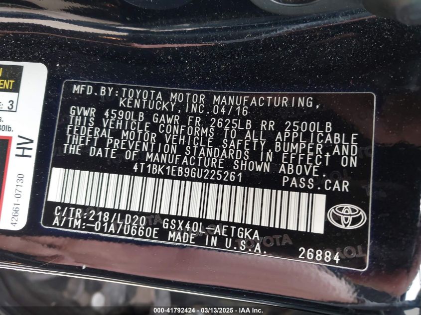 Color BlackCylinders 6Drive Front wheel driveVIN 4T1BK1EB9GU******State Run & Drive VerifiedDamage Front rightAuction date 2025-03-26 AutoRIA