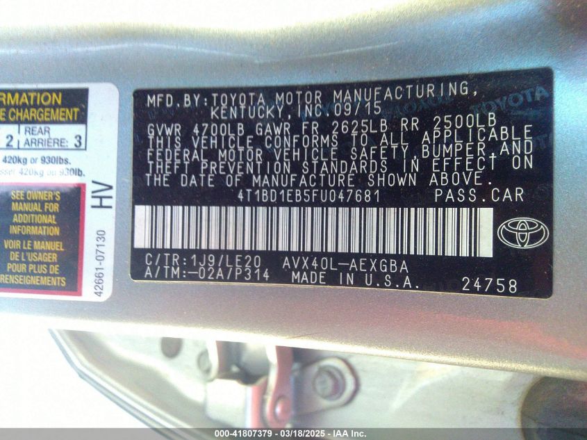 2015 TOYOTA AVALON 2015 Hybrid, 2.5, Front wheel drive, VIN - 4T1BD1EB5FU****** from the USA