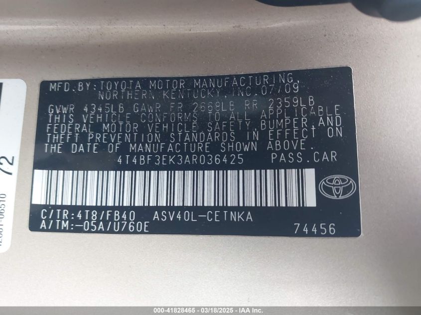 Color GoldCylinders 4Drive Front wheel driveVIN 4T4BF3EK3AR******State Run & Drive VerifiedDamage BackAuction date 2025-03-20 AutoRIA