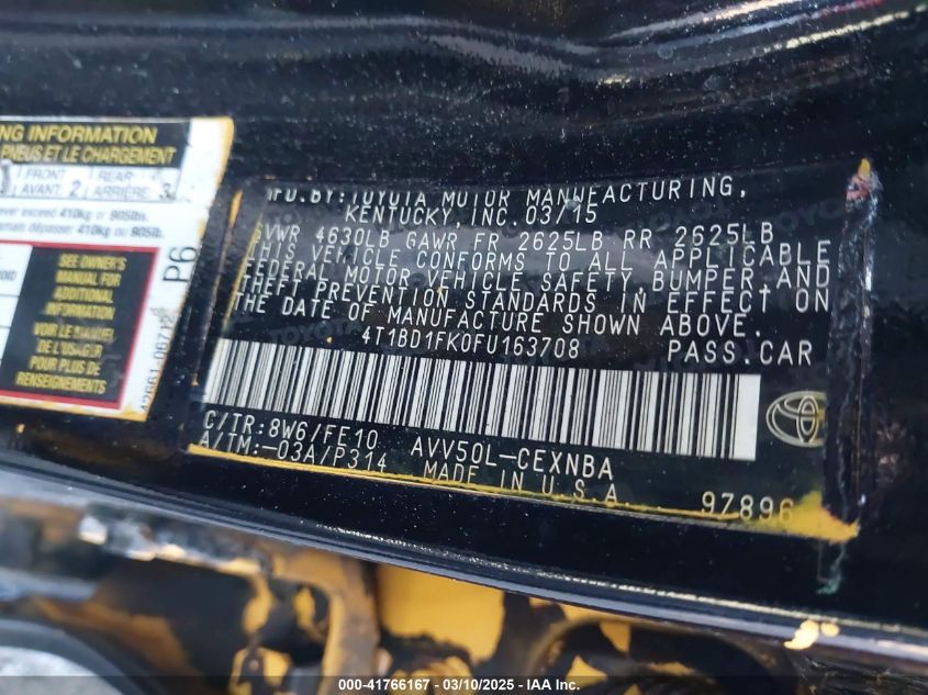 2015 TOYOTA CAMRY HYBRID 2015 Hybrid, 2.5, Front wheel drive, VIN - 4T1BD1FK0FU****** from the USA