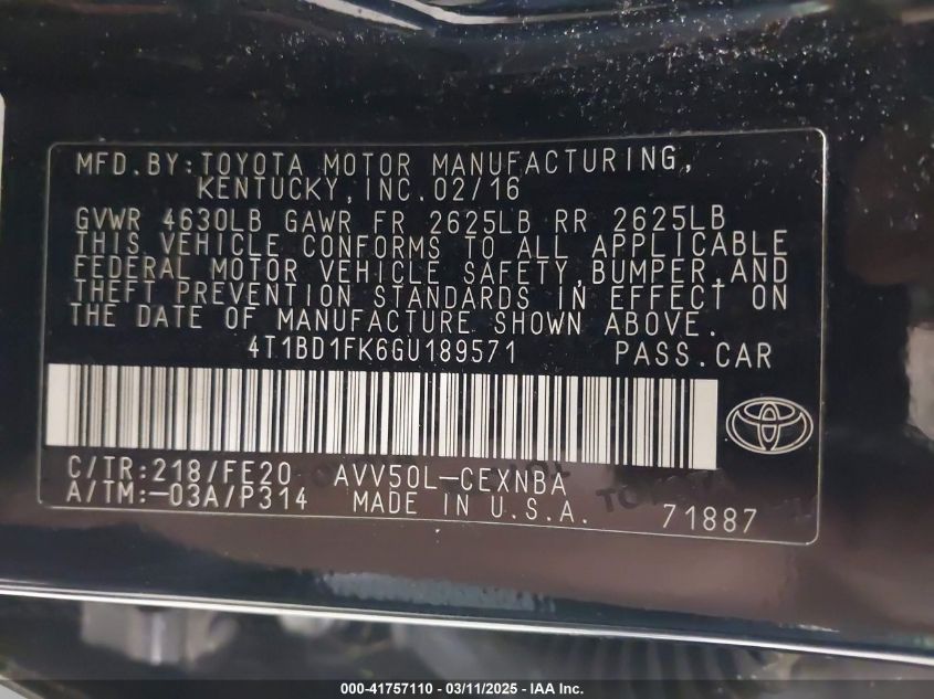 Color BlackCylinders 4Drive Front wheel driveVIN 4T1BD1FK6GU******State Run & Drive VerifiedDamage InsignificantAuction date 2025-03-26 AutoRIA