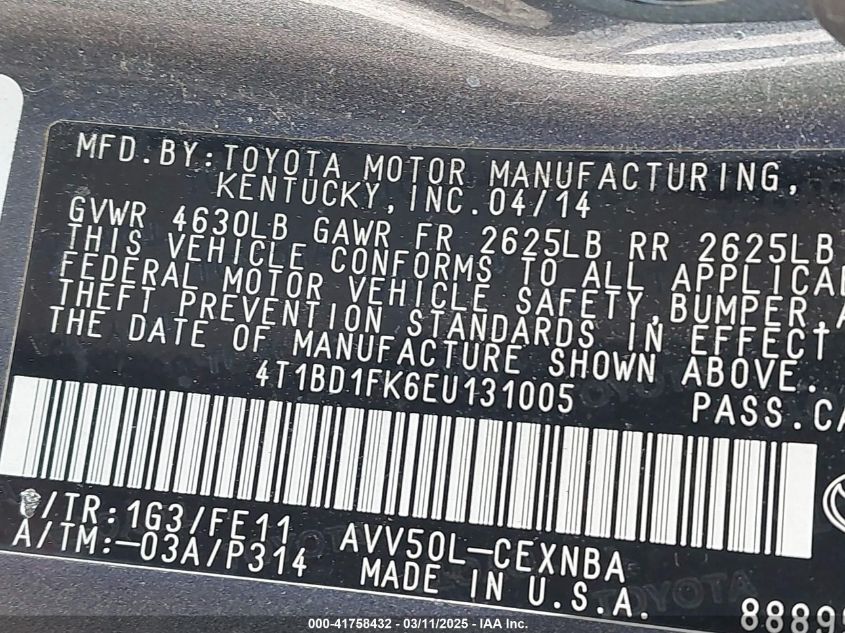 2014 TOYOTA CAMRY HYBRID 2014 Hybrid, 2.5, Front wheel drive, VIN - 4T1BD1FK6EU****** from the USA