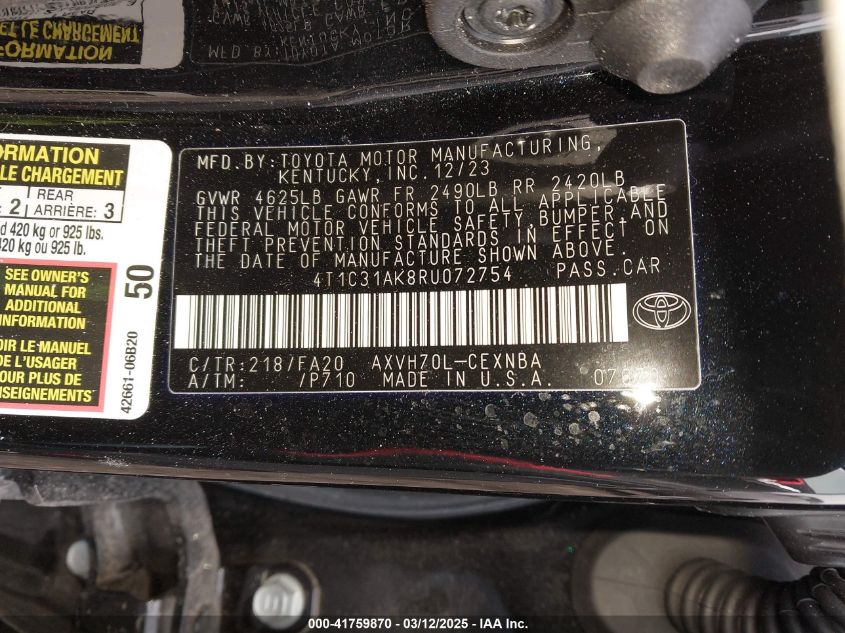 2024 TOYOTA CAMRY HYBRID 2024 Hybrid, 2.5, Front wheel drive, VIN - 4T1C31AK8RU****** from the USA