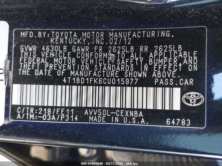 Color GrayCylinders 4Drive Front wheel driveVIN 4T1BD1FK6CU******State Run & Drive VerifiedDamage Front left AutoRIA