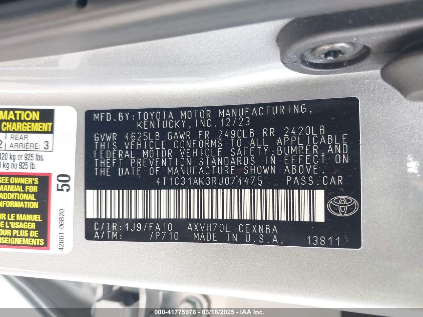 2024 TOYOTA CAMRY HYBRID 2024 Hybrid, 2.5, Front wheel drive, VIN - 4T1C31AK3RU****** from the USA