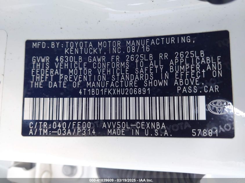 2017 TOYOTA CAMRY HYBRID 2017 Hybrid, 2.5, Front wheel drive, VIN - 4T1BD1FKXHU****** from the USA