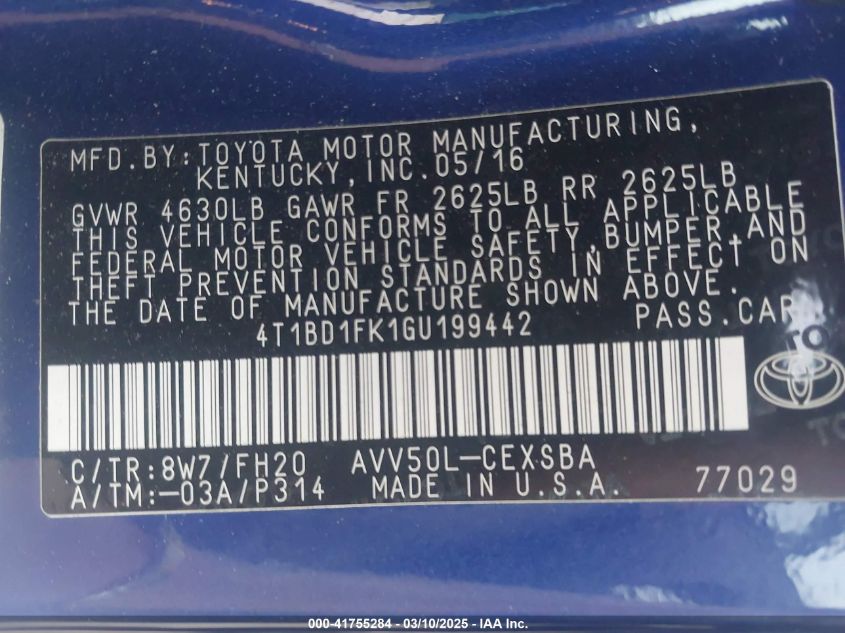 Color BlueCylinders 4Drive Front wheel driveVIN 4T1BD1FK1GU******State Run & Drive VerifiedDamage Front or backAuction date 2025-03-25 AutoRIA
