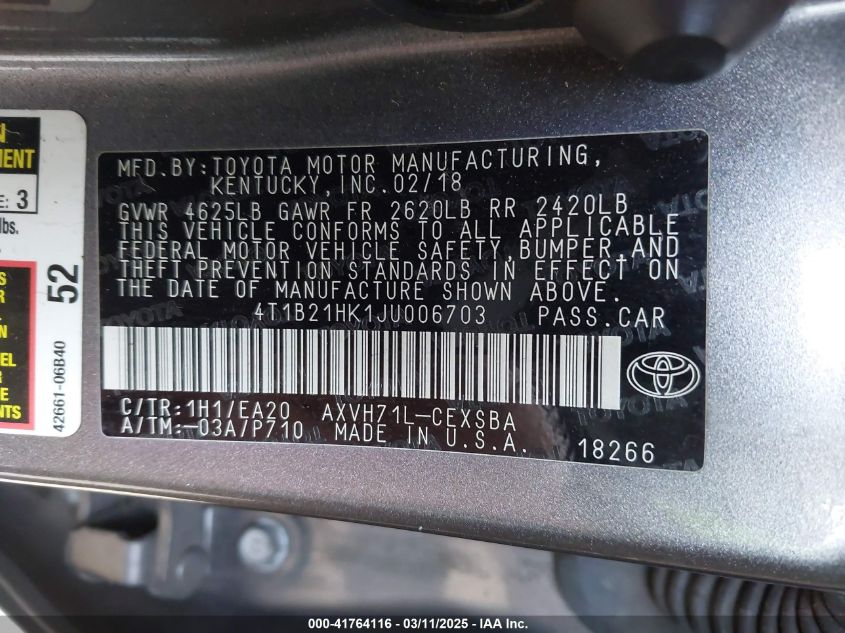 Color GrayCylinders 4Drive Front wheel driveVIN 4T1B21HK1JU******State Run & Drive VerifiedDamage Back AutoRIA