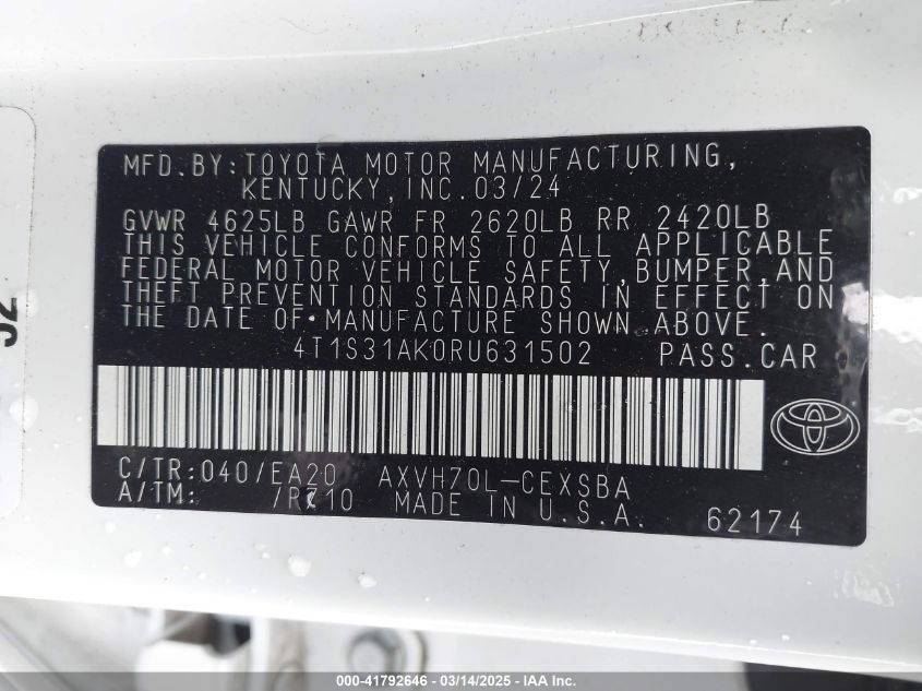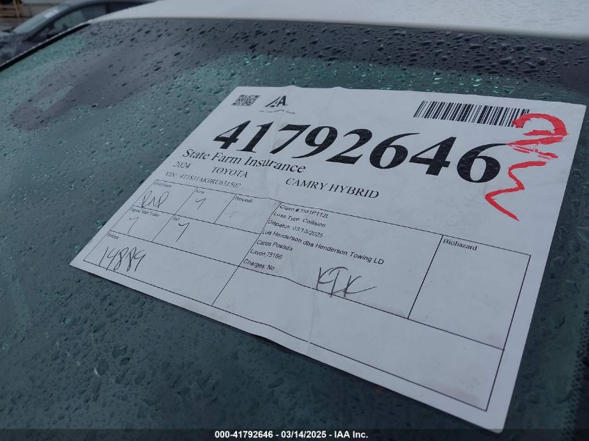2024 TOYOTA CAMRY HYBRID 2024 Hybrid, 2.5, Front wheel drive, VIN - 4T1S31AK0RU****** from the USA