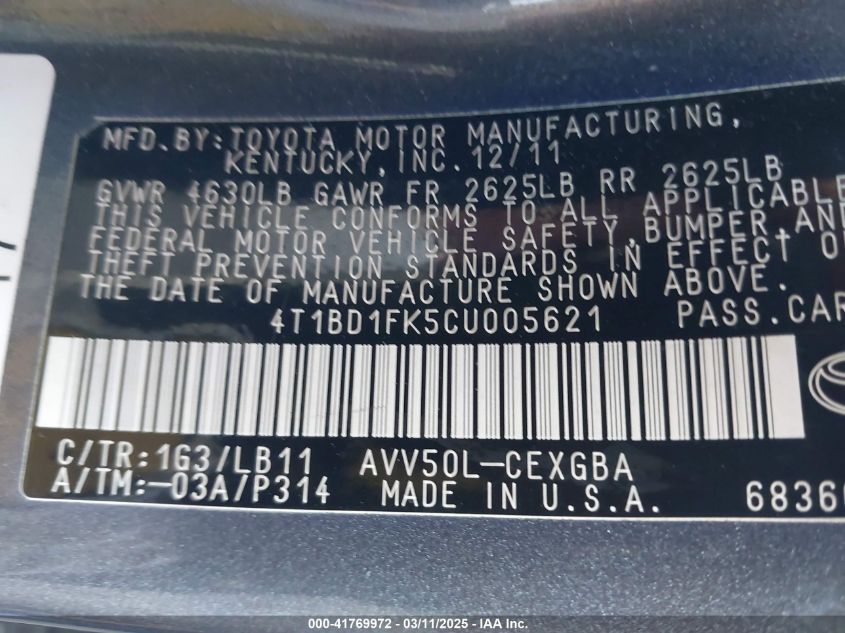 Color GrayCylinders 4Drive Front wheel driveVIN 4T1BD1FK5CU******State Run & Drive VerifiedDamage Front left AutoRIA