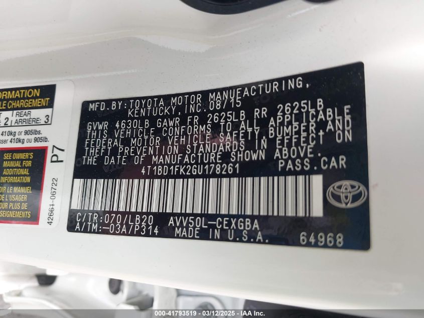 2016 TOYOTA CAMRY HYBRID 2016 Hybrid, 2.5, Front wheel drive, VIN - 4T1BD1FK2GU****** from the USA