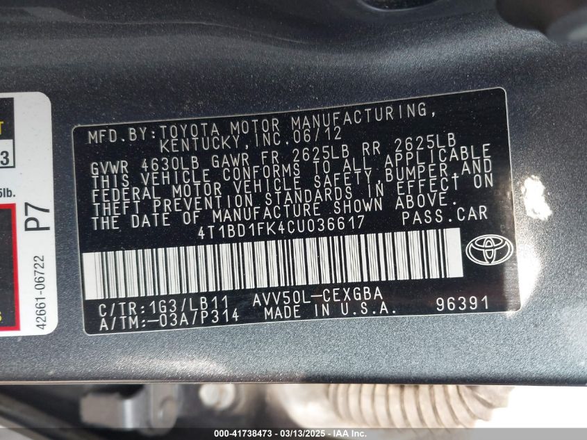 2012 TOYOTA CAMRY HYBRID 2012 Hybrid, 2.5, Front wheel drive, VIN - 4T1BD1FK4CU****** from the USA