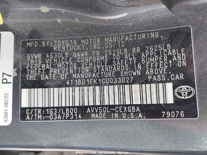 Color GrayCylinders 4Drive Front wheel driveVIN 4T1BD1FK1CU******State Run & Drive VerifiedDamage Right side AutoRIA