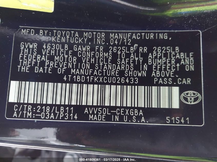 2012 TOYOTA CAMRY HYBRID 2012 Hybrid, 2.5, Front wheel drive, VIN - 4T1BD1FKXCU****** from the USA