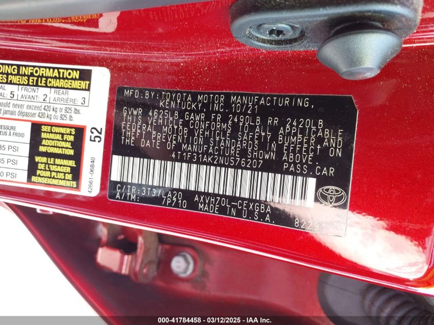 2022 TOYOTA CAMRY HYBRID 2022 Hybrid, 2.5, Front wheel drive, VIN - 4T1F31AK2NU****** from the USA
