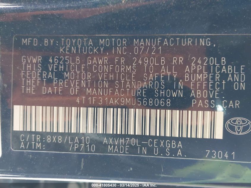 2021 TOYOTA CAMRY HYBRID 2021 Hybrid, 2.5, Front wheel drive, VIN - 4T1F31AK9MU****** from the USA