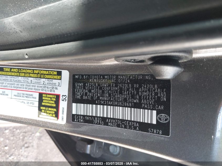 2024 TOYOTA CAMRY HYBRID 2024 Hybrid, 2.5, Front wheel drive, VIN - 4T1K31AK0RU****** from the USA