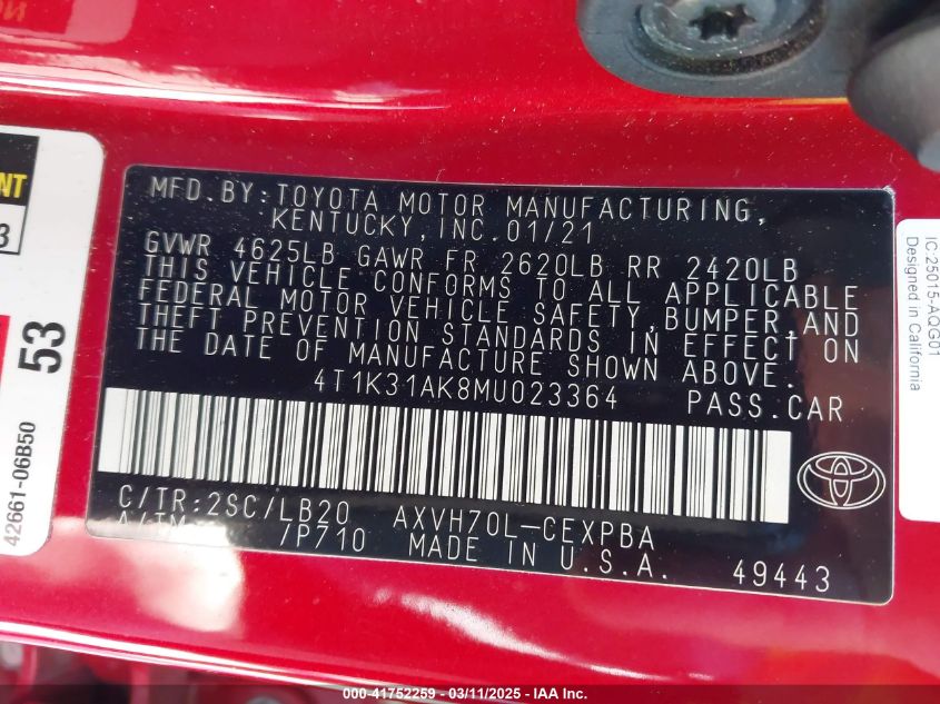 2021 TOYOTA CAMRY HYBRID 2021 Hybrid, 2.5, Front wheel drive, VIN - 4T1K31AK8MU****** from the USA