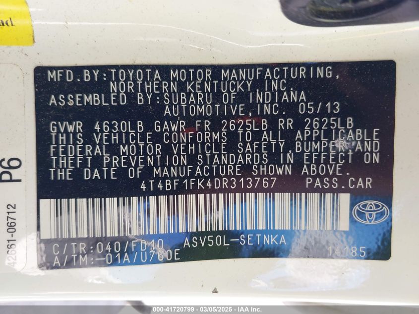 Color WhiteCylinders 4Drive Front wheel driveVIN 4T4BF1FK4DR******State Run & Drive VerifiedDamage Left side AutoRIA