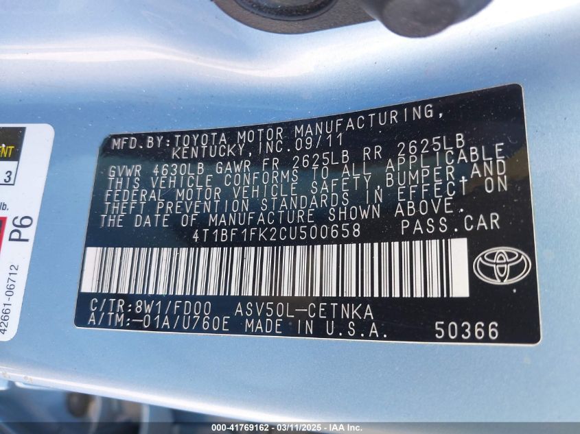 Color BlueCylinders 4Drive Front wheel driveVIN 4T1BF1FK2CU******State Run & Drive VerifiedDamage Back AutoRIA
