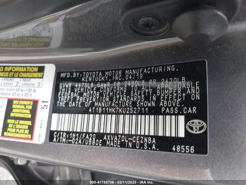2019 TOYOTA CAMRY 2019 Gasoline, 2.5, Front wheel drive, VIN - 4T1B11HK7KU****** from the USA