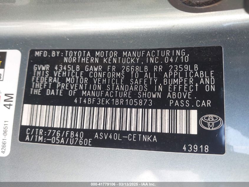 2011 TOYOTA CAMRY 2011 Gasoline, 2.5, Front wheel drive, VIN - 4T4BF3EK1BR****** from the USA