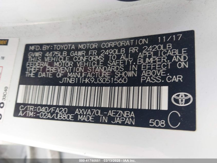 Color WhiteCylinders 4Drive Front wheel driveVIN JTNB11HK9J3******State Run & Drive VerifiedDamage Front or back AutoRIA