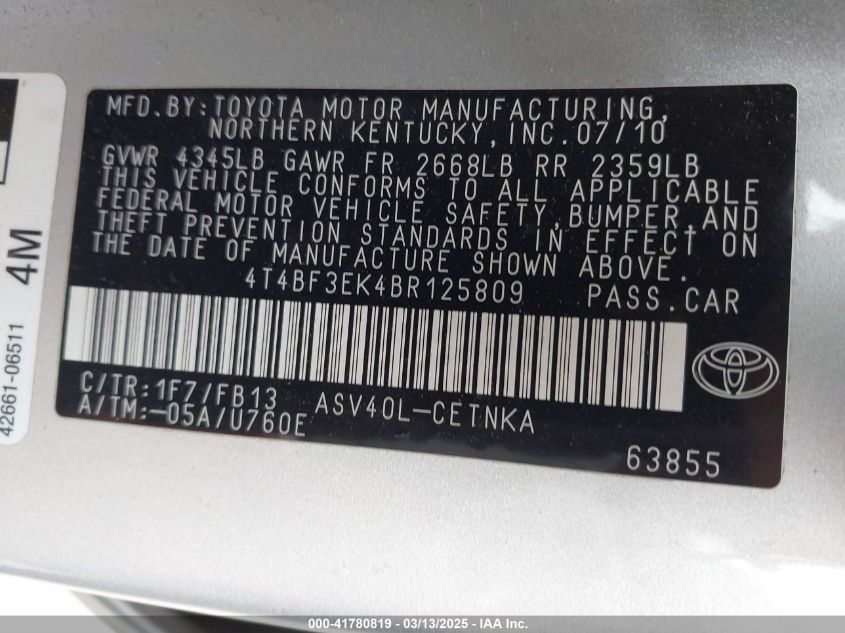 2011 TOYOTA CAMRY 2011 Gasoline, 2.5, Front wheel drive, VIN - 4T4BF3EK4BR****** from the USA