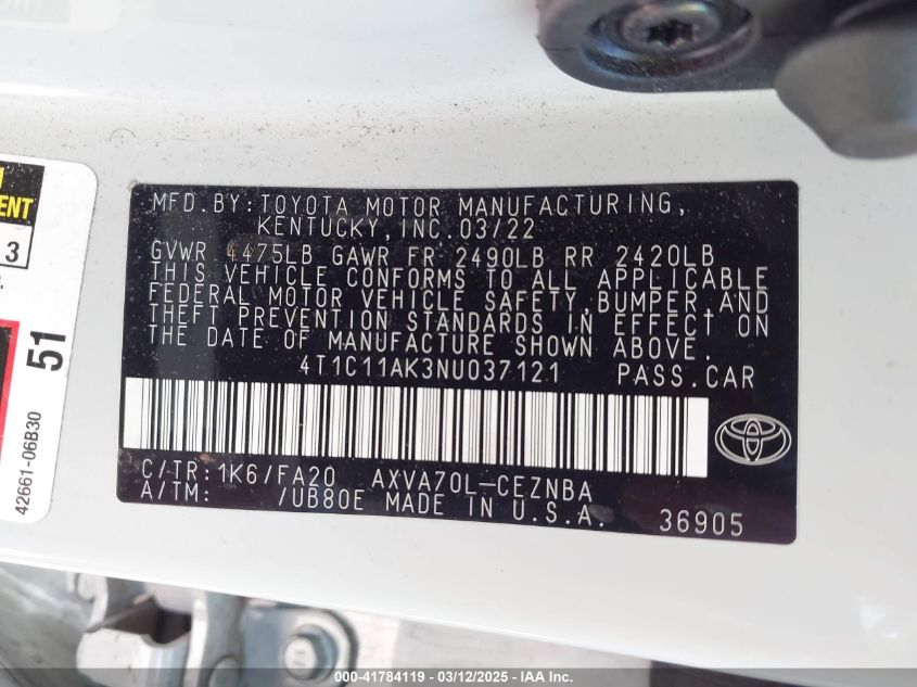 2022 TOYOTA CAMRY 2022 Gasoline, 2.5, Front wheel drive, VIN - 4T1C11AK3NU****** from the USA