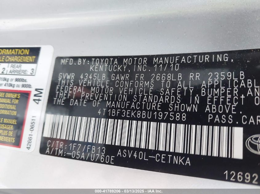 Color GrayCylinders 4Drive Front wheel driveVIN 4T1BF3EK8BU******State Run & Drive VerifiedDamage Left side AutoRIA