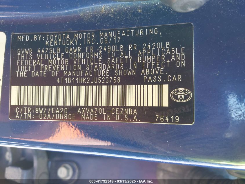 2018 TOYOTA CAMRY 2018 Gasoline, 2.5, Front wheel drive, VIN - 4T1B11HK2JU****** from the USA