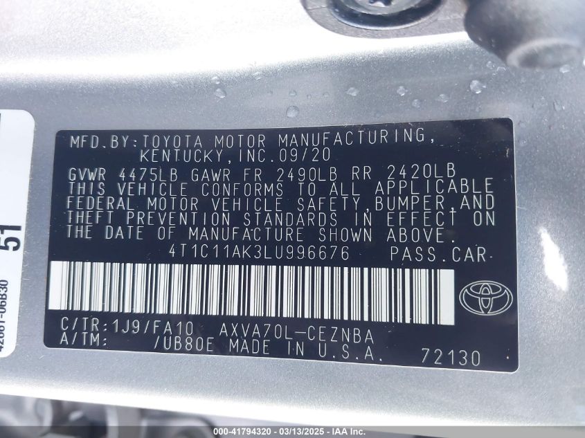 2020 TOYOTA CAMRY 2020 Gasoline, 2.5, Front wheel drive, VIN - 4T1C11AK3LU****** from the USA