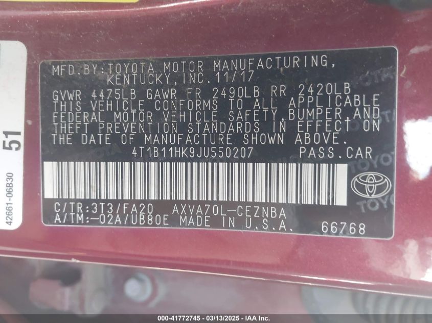 2018 TOYOTA CAMRY 2018 Gasoline, 2.5, Front wheel drive, VIN - 4T1B11HK9JU****** from the USA