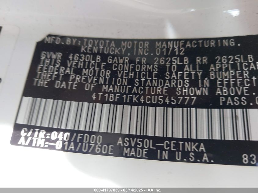 Color WhiteCylinders 4Drive Front wheel driveVIN 4T1BF1FK4CU******State Run & Drive VerifiedDamage Front or backAuction date 2025-03-25 AutoRIA