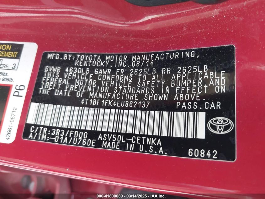 2014 TOYOTA CAMRY 2014 Gasoline, 2.5, Front wheel drive, VIN - 4T1BF1FK4EU****** from the USA