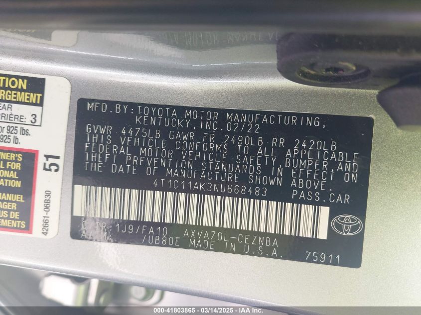 2022 TOYOTA CAMRY 2022 Gasoline, 2.5, Front wheel drive, VIN - 4T1C11AK3NU****** from the USA