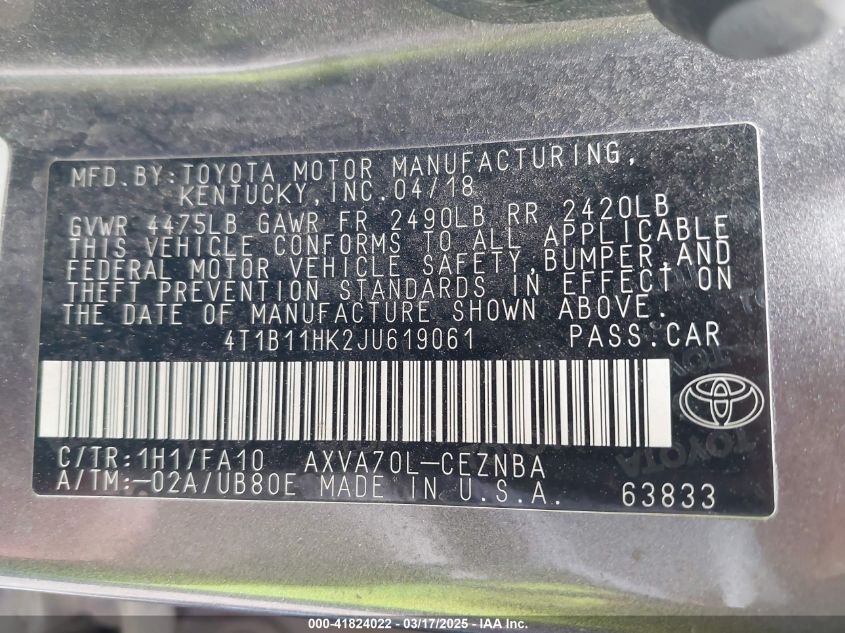 2018 TOYOTA CAMRY 2018 Gasoline, 2.5, Front wheel drive, VIN - 4T1B11HK2JU****** from the USA