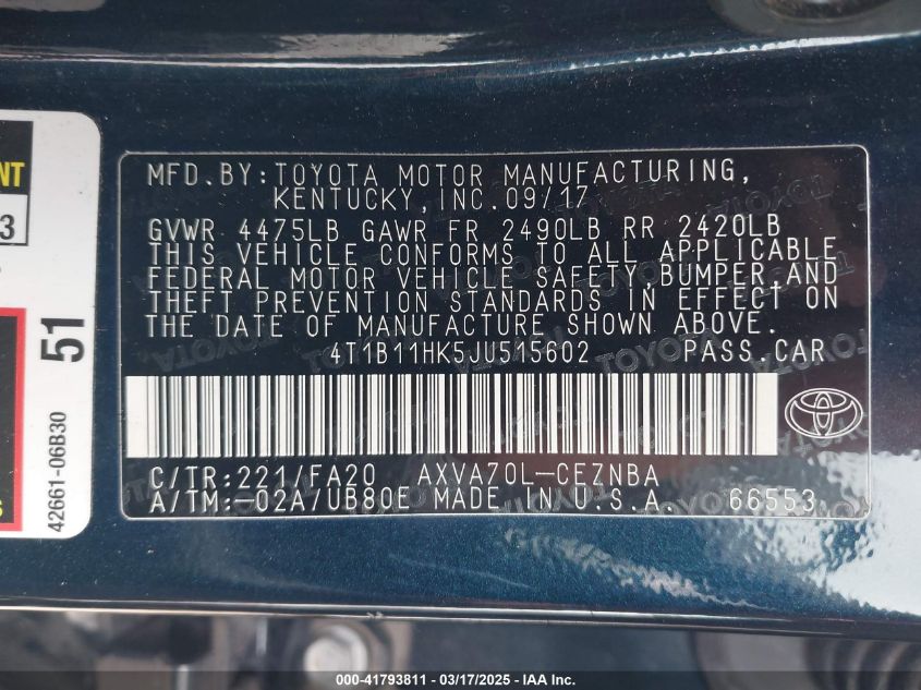 2018 TOYOTA CAMRY 2018 Gasoline, 2.5, Front wheel drive, VIN - 4T1B11HK5JU****** from the USA