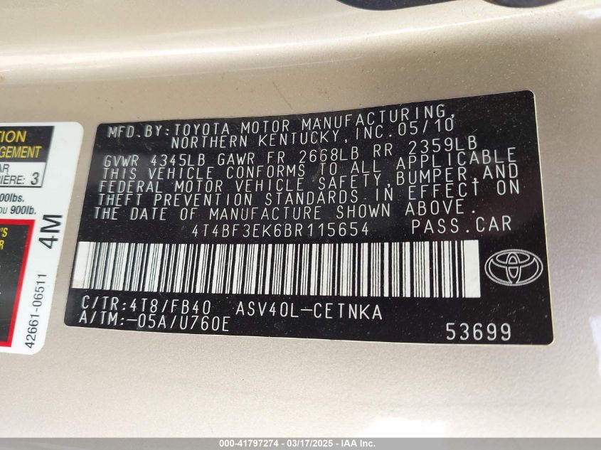 Color GoldCylinders 4Drive Front wheel driveVIN 4T4BF3EK6BR******State Run & Drive VerifiedDamage Front or back AutoRIA