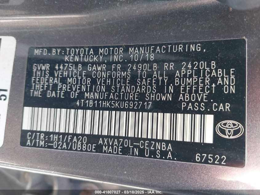 2019 TOYOTA CAMRY 2019 Gasoline, 2.5, Front wheel drive, VIN - 4T1B11HK5KU****** from the USA