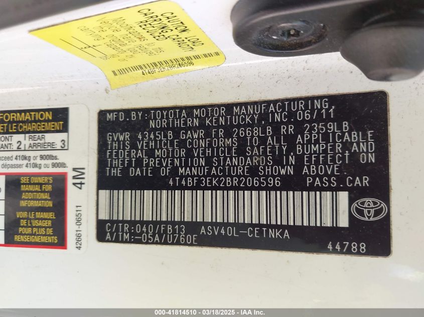 Color WhiteCylinders 4Drive Front wheel driveVIN 4T4BF3EK2BR******State Run & Drive VerifiedDamage Front and back AutoRIA
