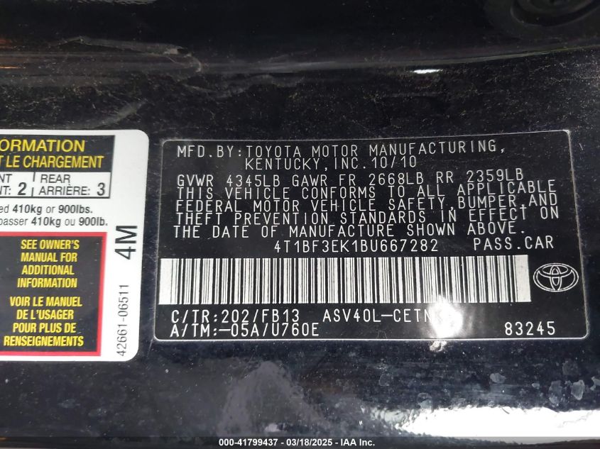 2011 TOYOTA CAMRY 2011 Gasoline, 2.5, Front wheel drive, VIN - 4T1BF3EK1BU****** from the USA