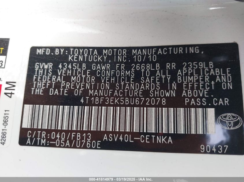Color WhiteCylinders 4Drive Front wheel driveVIN 4T1BF3EK5BU******State Run & Drive VerifiedDamage Back AutoRIA