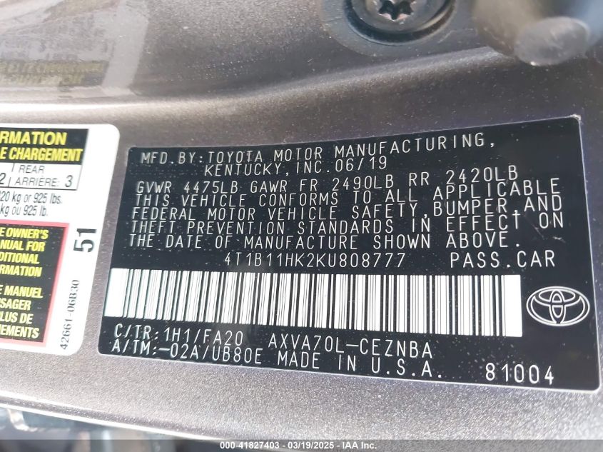2019 TOYOTA CAMRY 2019 Gasoline, 2.5, Front wheel drive, VIN - 4T1B11HK2KU****** from the USA
