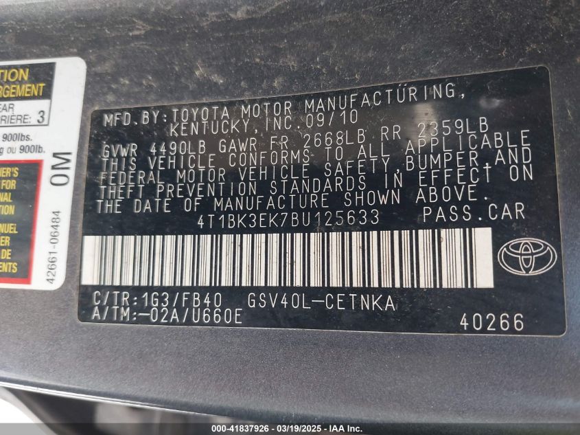 2011 TOYOTA CAMRY 2011 Gasoline, 3.5, Front wheel drive, VIN - 4T1BK3EK7BU****** from the USA