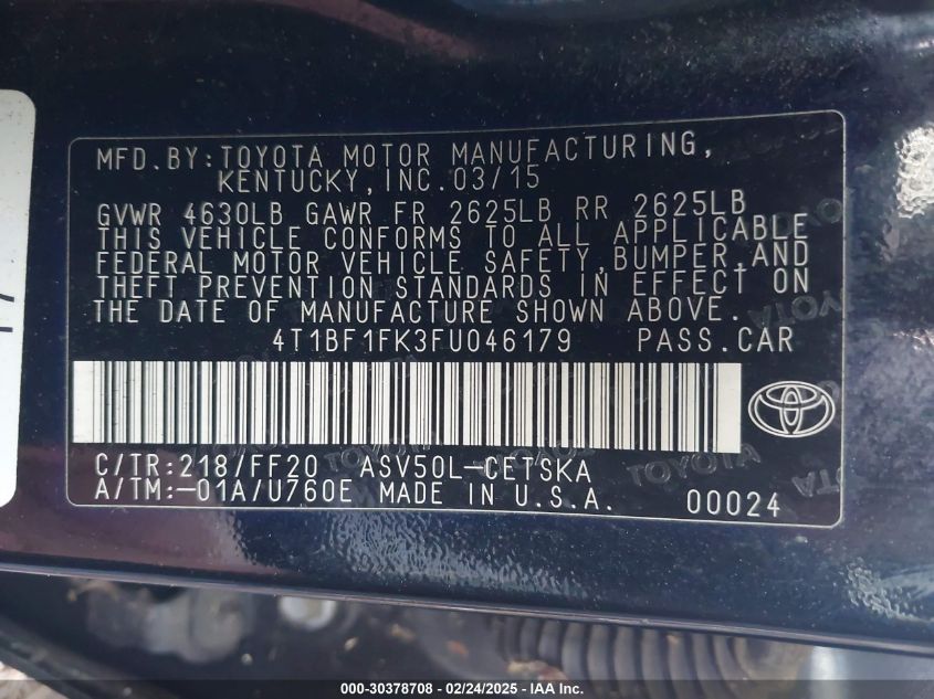 2015 TOYOTA CAMRY 2015 Gasoline, 2.5, Front wheel drive, VIN - 4T1BF1FK3FU****** from the USA