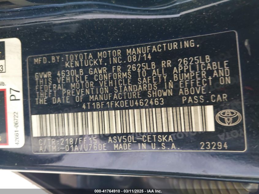 2014 TOYOTA CAMRY 2014 Gasoline, 2.5, Front wheel drive, VIN - 4T1BF1FK0EU****** from the USA